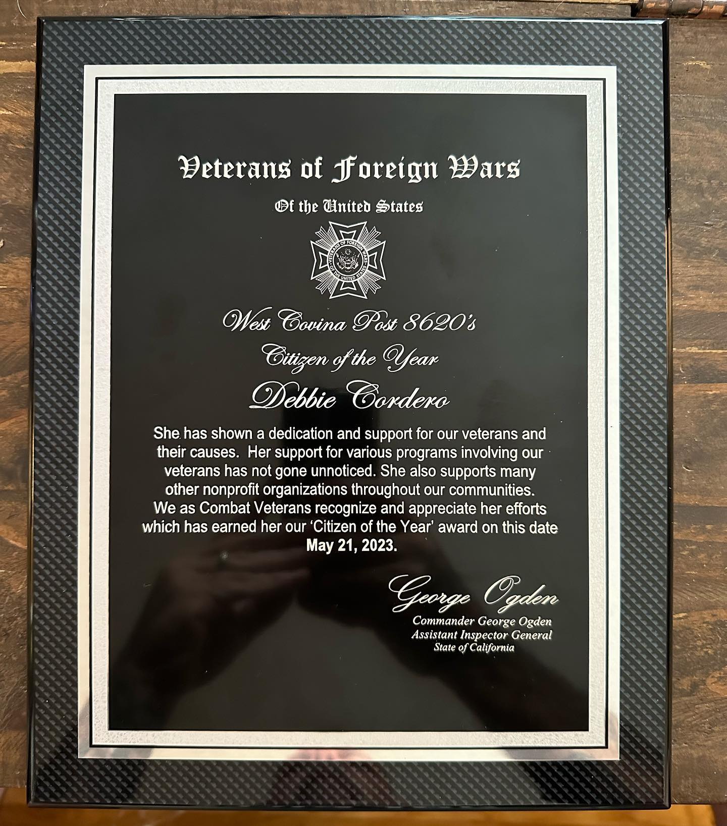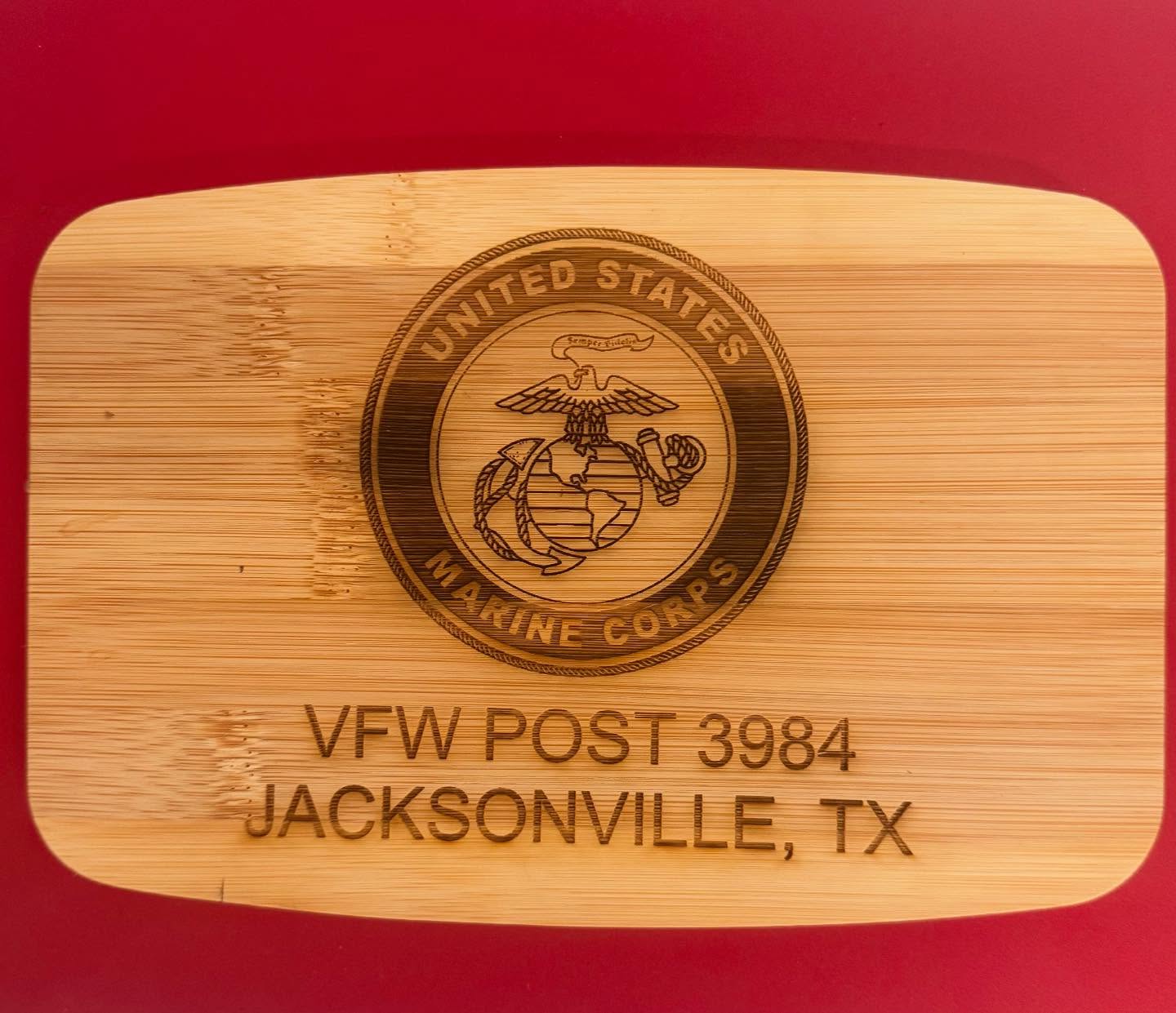 Knocked out a plaque for my VFW post. Plate is 8.5” x 11”, base is 10” x 13” heavy wood with a carbon fiber pattern.
