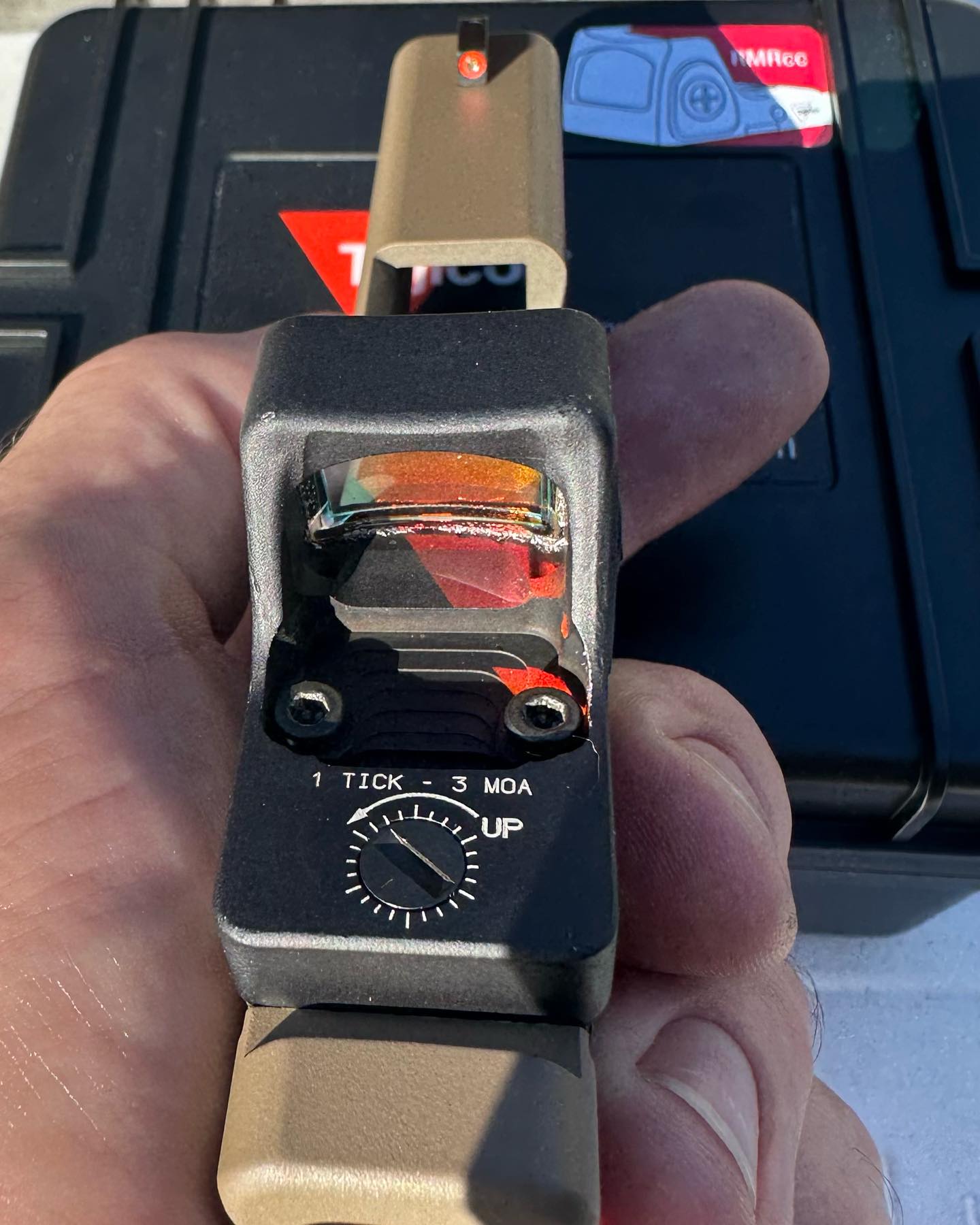 Glock 43 rocking a Trijicon RMRCC and suppressor height night sight and a fresh coat of cerakote FDE. Slide cut by.