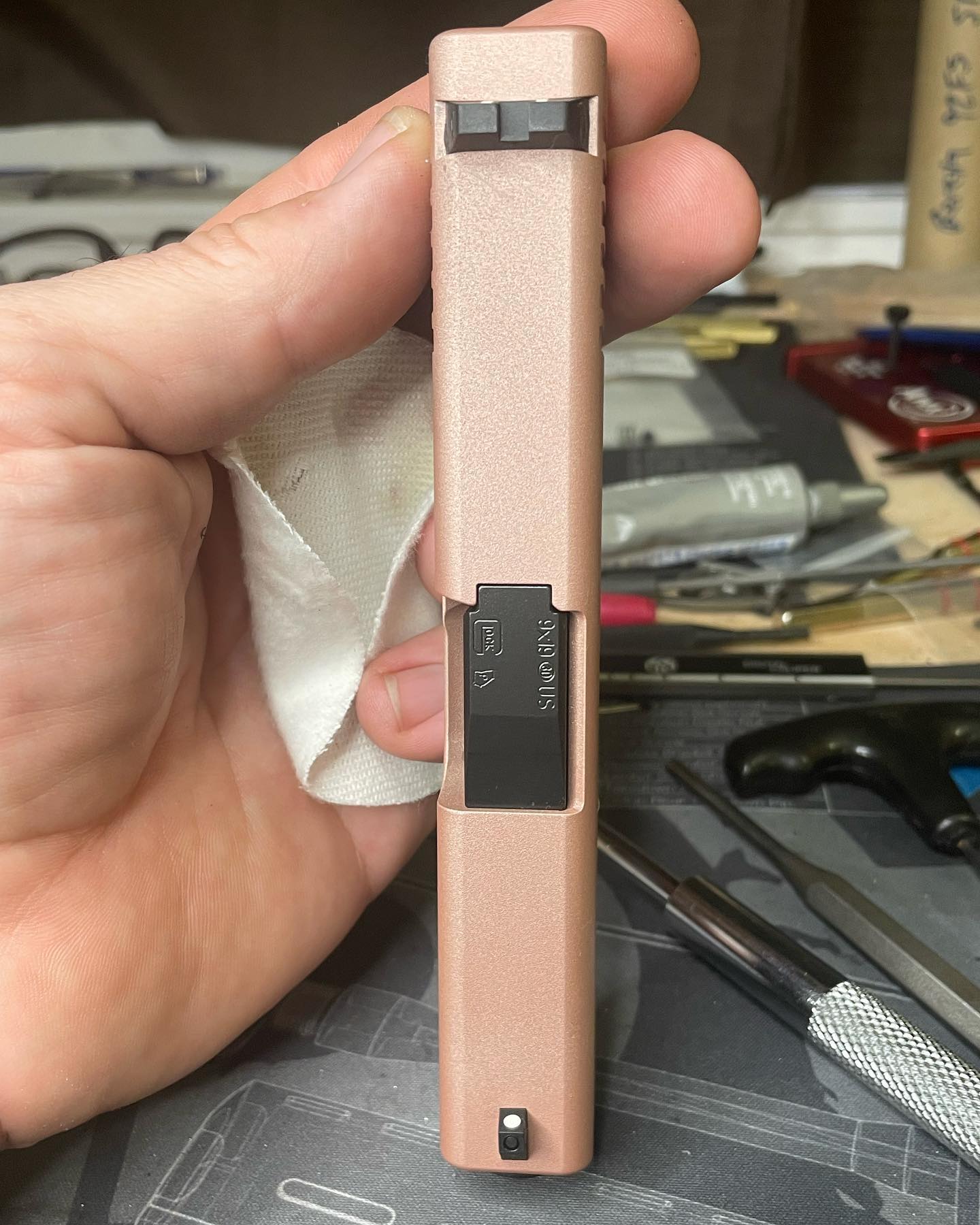 From Ghetto Gold to Back n black. Quick redcoat on a Lightened Glock slide.