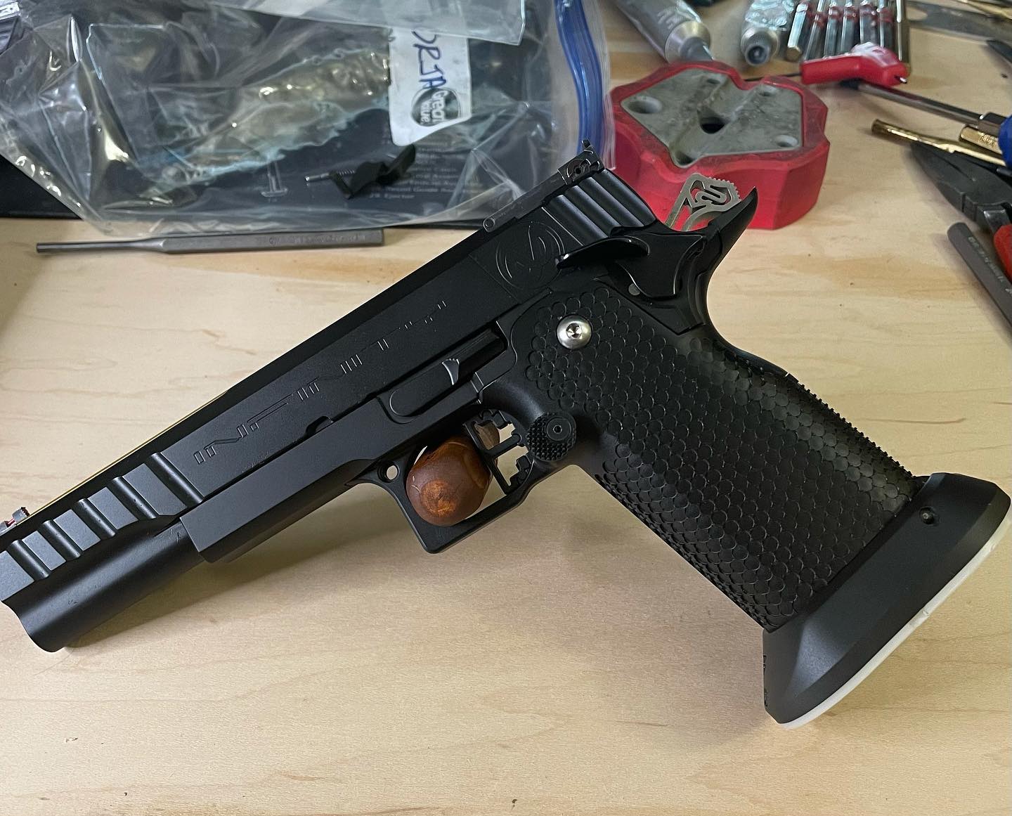 Progress on a 2011 build. Waiting for the frame to come back from the machinist. It’s getting fitted for a Nowlin ramped barrel.