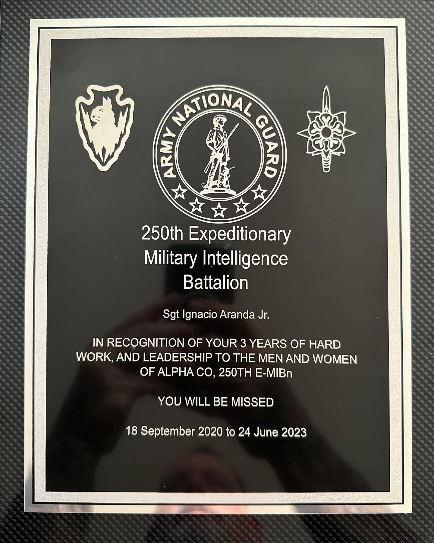 Another well deserving Guard member receiving a custom plaque. We are always her to service your needs!!