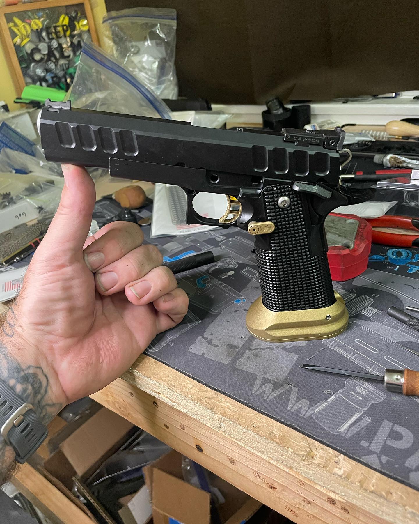 put his pistols back together after we delivered the freshly coated frames and slides!! Beautiful!!